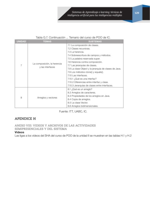 Tabla G.7. Continuación ... Temario del curso de POO de IC.