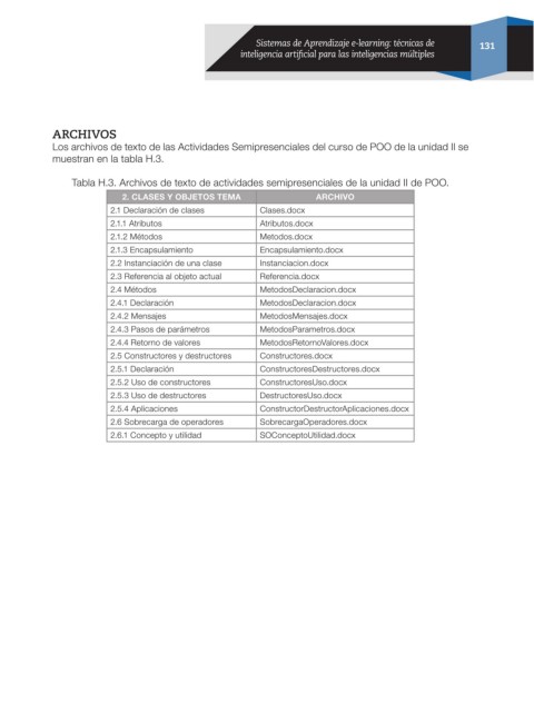 Tabla H.3. Archivos de texto de actividades semipresenciales de la unidad II de POO.