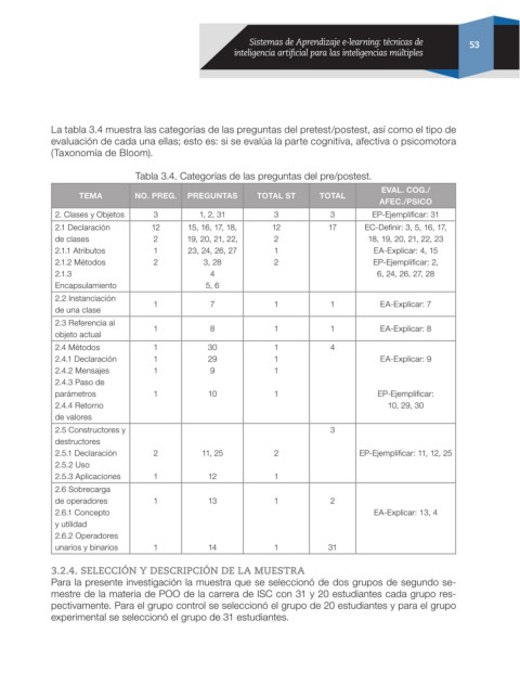 La tabla 3.4 muestra las categorías de las preguntas del pretest/postest, así como el tipo de