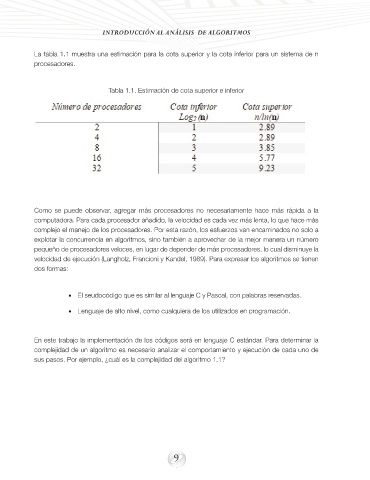 La tabla 1.1 muestra una estimación para la cota superior y la cota inferior para un sistema de n