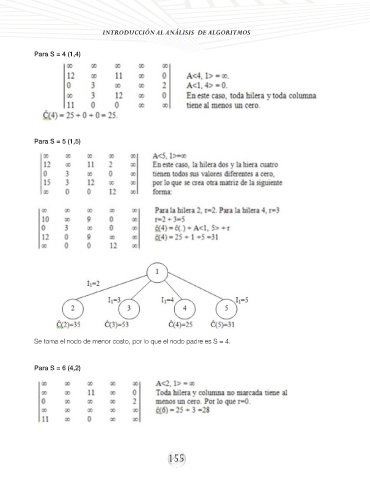 INTRODUCCIÓN AL ANÁLISIS DE ALGORITMOS Para S = 4 (1,4) Para S = 5 (1,5) Se toma el nodo de menor costo, por lo que el nodo padre es S = 4. Para S = 6 (4,2) 155